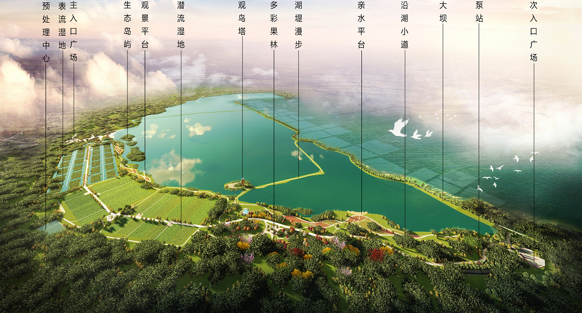 3、水生態(tài)工程:潛流濕地工程6h平方米;表流濕地人工濕地7.9 h平方米;綠化種植25.28h平方米,配套服務建筑共計1132.46平方米;修建環(huán)湖路10.932千米,次支園路6.580千米;場地鋪裝共計23127平方米;生態(tài)浮島、太陽能等原位處理工程;