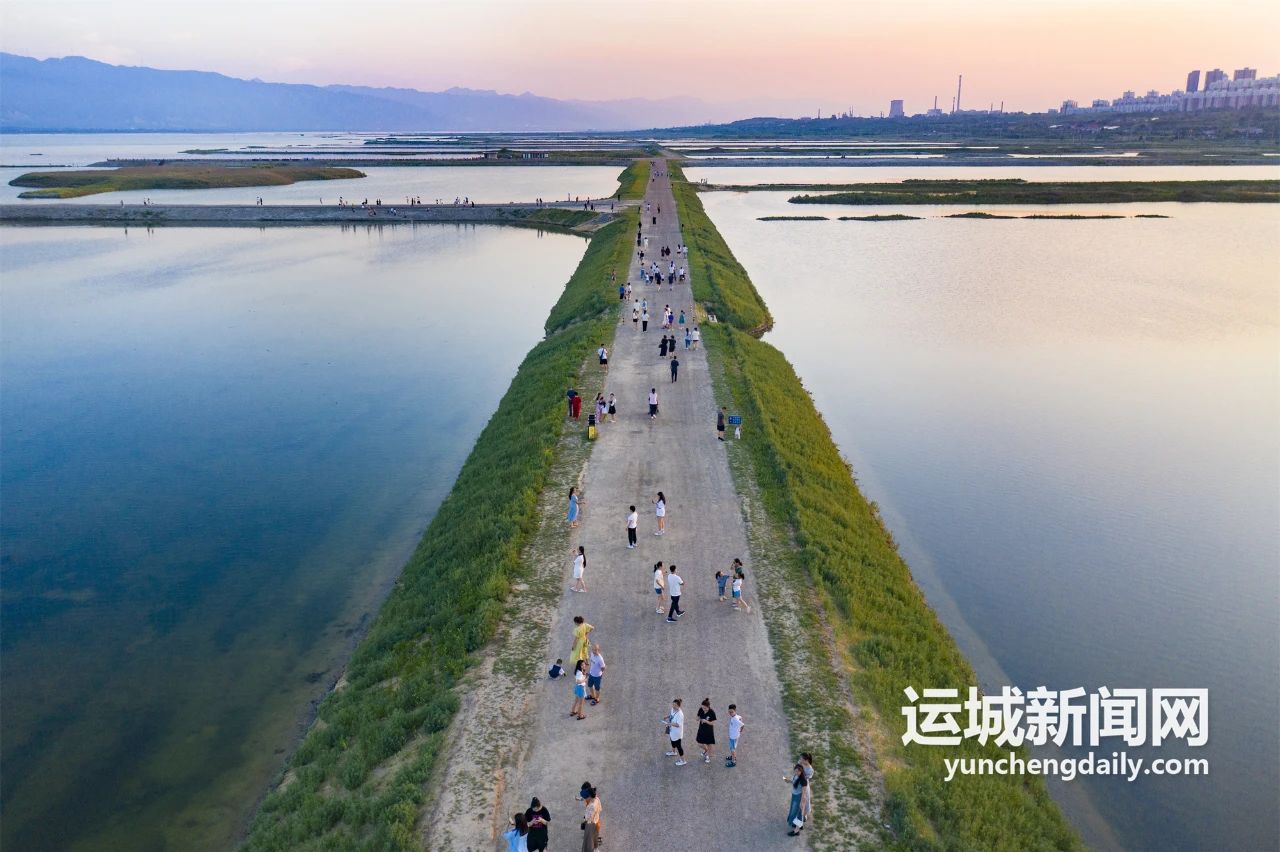 傍晚,沿著鹽湖岸畔緩緩前行,阡陌縱橫,抬頭是山,低頭是“海”,夕陽西下,余暉鋪灑湖面,條山倒映湖中……此情此景,徐徐南風(fēng)會(huì)帶你穿越回4000多年前的歲月,耳畔傳來舜帝撫琴引吭《南風(fēng)歌》的聲音:“南風(fēng)之薰兮,可以解吾民之慍兮。南風(fēng)之時(shí)兮,可以阜吾民之財(cái)兮……”