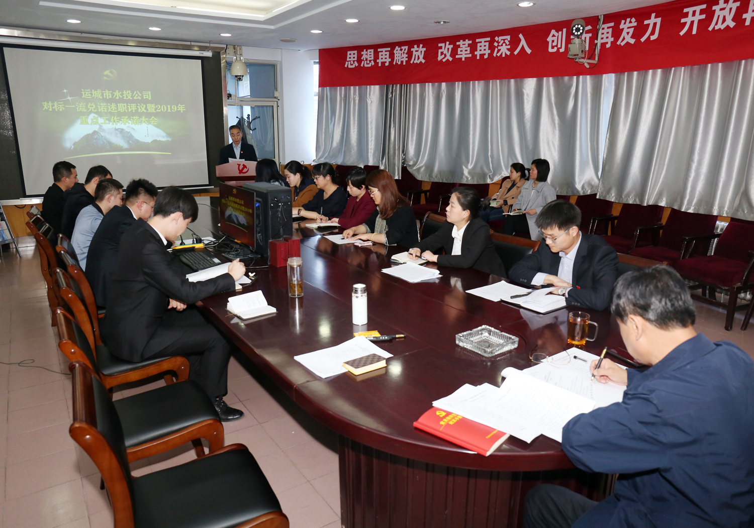會上,領(lǐng)導班子副職和黨辦、綜合辦、財務部、工程部主要負責人圍繞2018年年初承諾事項兌諾述職,就2019年重點工作向公司黨委、董事會和全體員工進行公開承諾。公司班子成員進行了點評,參會人員進行了述職測評。